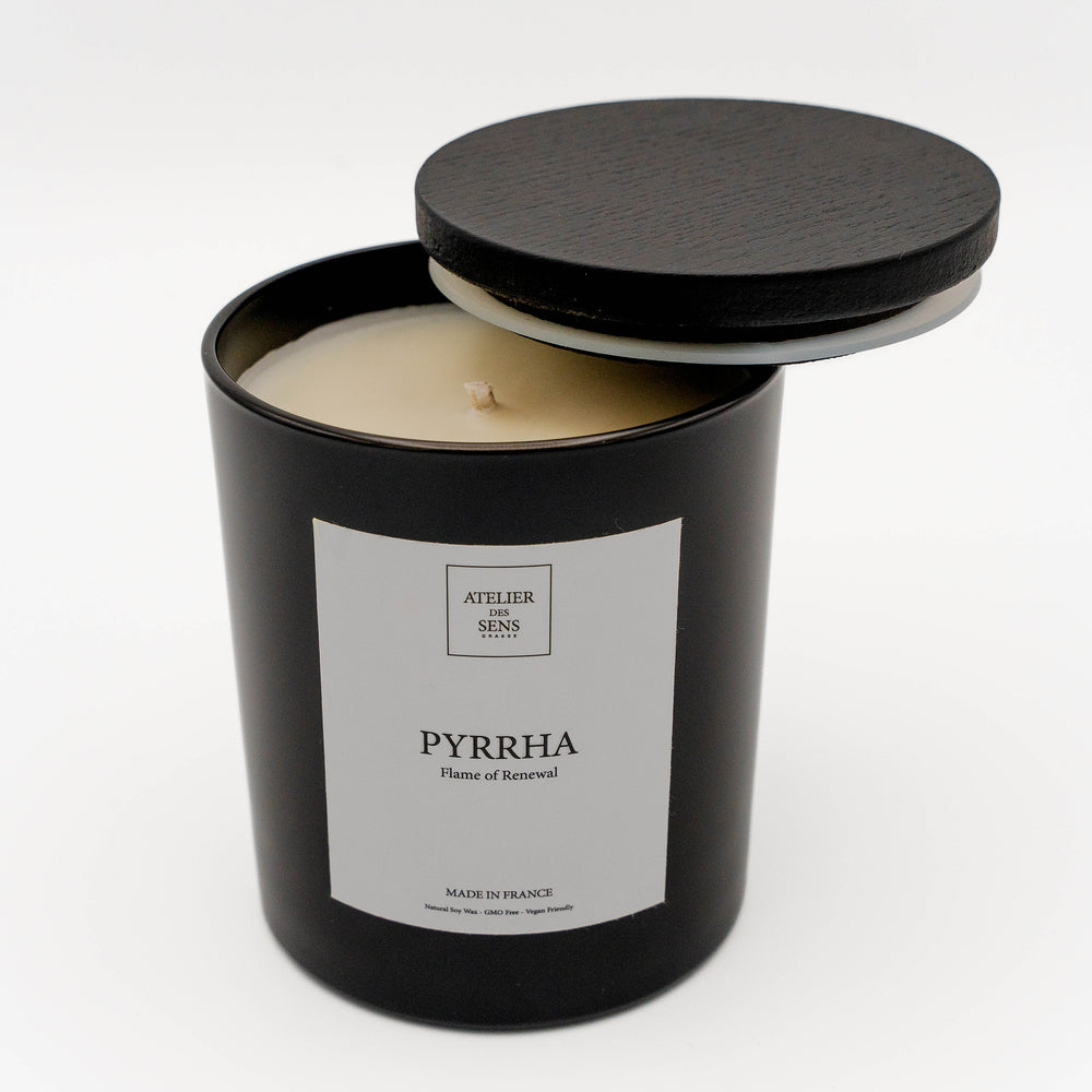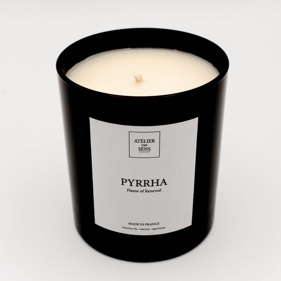 Our Pyrrha candle captures this transformative spirit through an exquisite blend of vibrant orange and warming spices. The initial notes of sun-kissed citrus ascend like dawn's first light, gradually revealing a heart of carefully balanced spices, cinnamon, clove, and cardamom, that dance like flames around the central fragrance.
